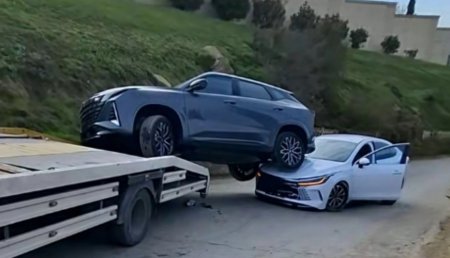 Evakuatorun üzərində daşınan avtomobil hərəkət zamanı tarazlığını itirərək arxadan gələn minik maşınının üstünə düşüb. Nəticədə, hər iki nəqliyyat vasitəsinə ciddi ziyan dəyib.