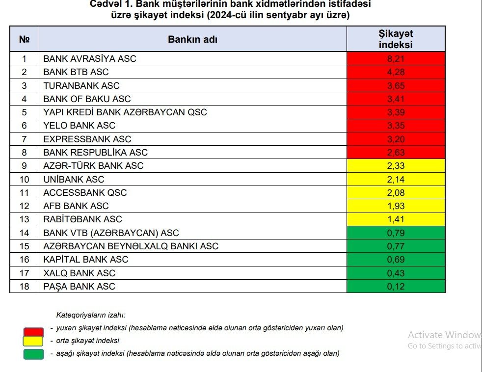 2024-cü ilin sentyabr ayında Azərbaycanda ən çox şikayət edilən bank 8.21 indeksi ilə "Bank Avrasiya" seçilib.