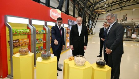 Azərbaycan Prezidenti İlham Əliyev Bakıda “Nobel Food İndustry” MMC-nin müxtəlif növ və çeşiddə qəlyanaltı məhsullarının istehsalı zavodunun açılışında iştirak edib.