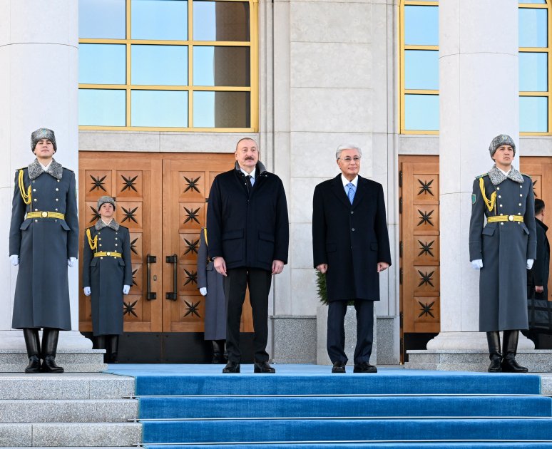 Dövlət başçısını Qazaxıstan Prezidenti Kasım-Jomart Tokayev qarşılayıb.