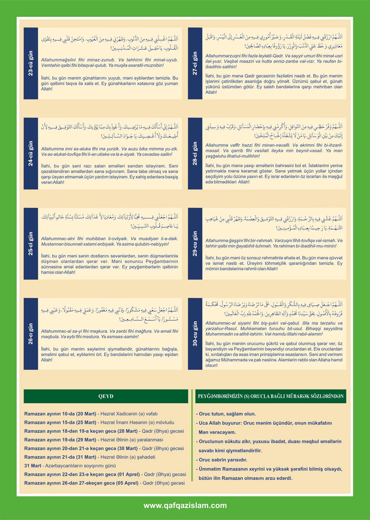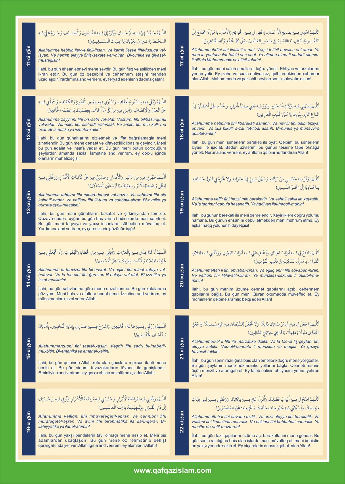 “İlahi, səndən ötrü oruc tutdum, sənin verdiyin ruzi ilə iftar açdım və sənə təvəkkül etdim. Bağışlayan və mehriban Allahın adı ilə. Ey hüdudsuz bağışlama sahibi, mənim günahlarımı bağışla!”