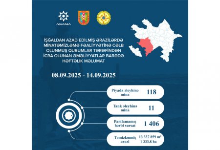 Azərbaycan Respublikasının Minatəmizləmə Agentliyi (ANAMA) işğaldan azad edilmiş ərazilərdə minatəmizləmə fəaliyyətinə cəlb olunmuş qurumlar tərəfindən 8-14 sentyabr tarixlərində icra edilən minatəmizləmə əməliyyatlarına dair məlumat açıqlayıb.